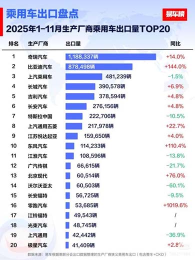 据易车数据显示,2025年11月,比亚迪乘用车出口量达到12.8万台,同比增长313.4%;今年1-11月累计出口87.8万台,同比增长144%,较2024全年总出口量已实现翻倍式增长,比亚迪成为中国出口增速最快的车企之一。