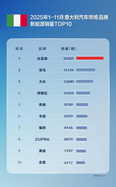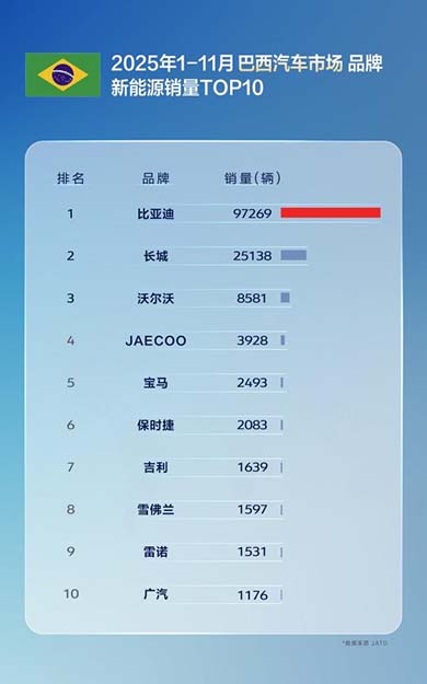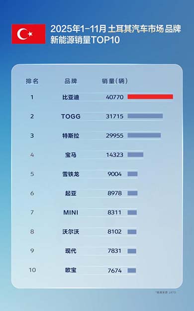 11月,比亚迪在巴西、土耳其、意大利、西班牙、匈牙利、克罗地亚等国拿下了新能源汽车销量第一,在新加坡等国家获得全品牌销冠。1-11月累计表现同样不俗,在巴西、土耳其、西班牙、意大利等国,比亚迪位列新能源汽车品牌销量榜首,获得多个国家消费者认可;在新加坡、中国香港等地区市场荣膺全品牌销量第一。